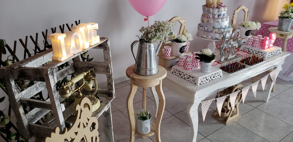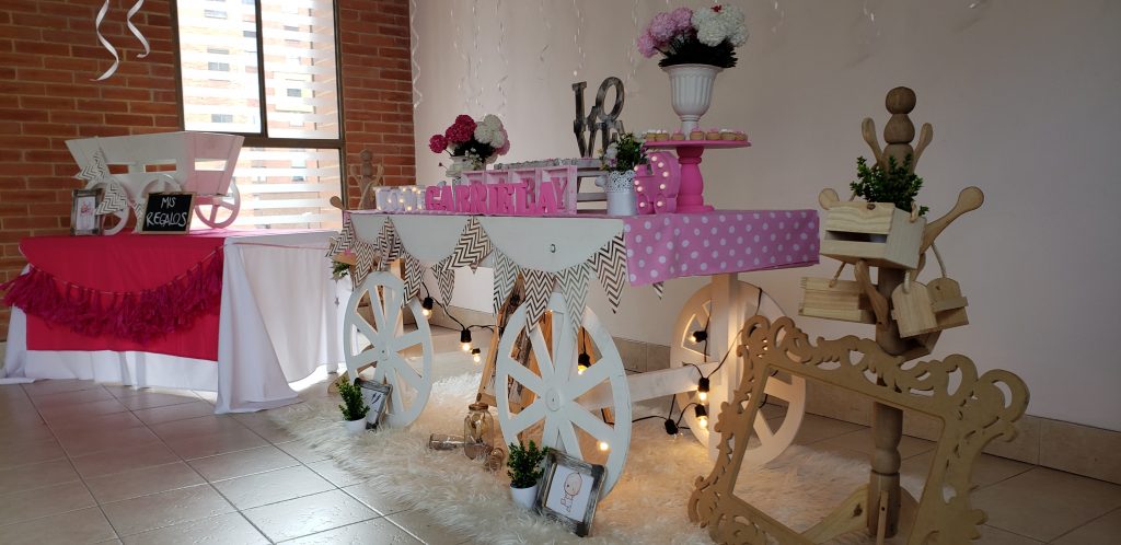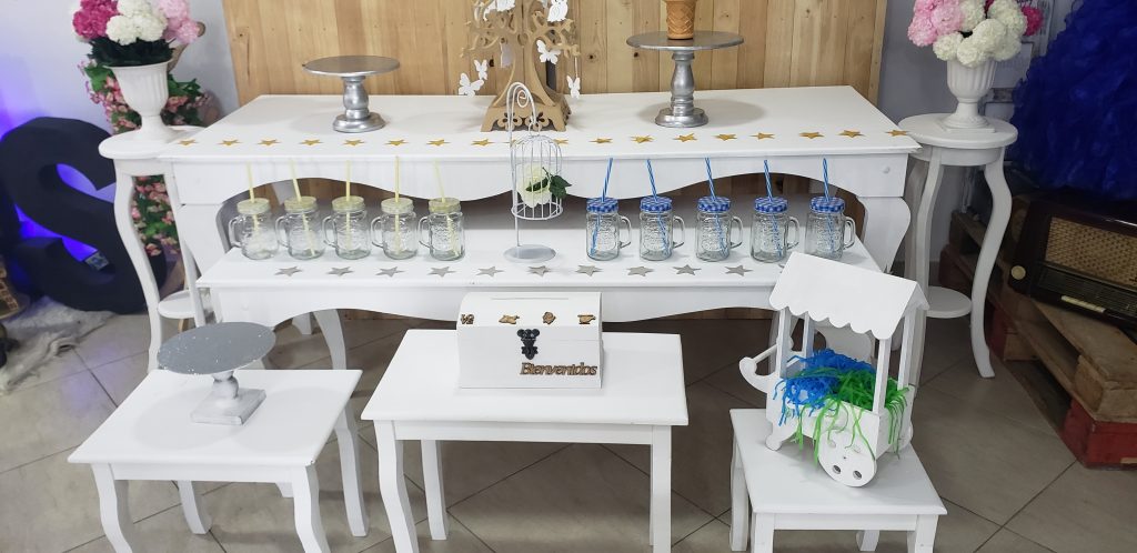 mesas tipo carreta en color blanco para temáticas de baby shower