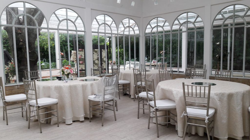 - Mantelería y mobiliario Manteles, tapas, forros de sillas, fajón, servilletas, mesas y sillas necesarias.