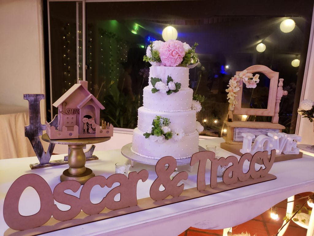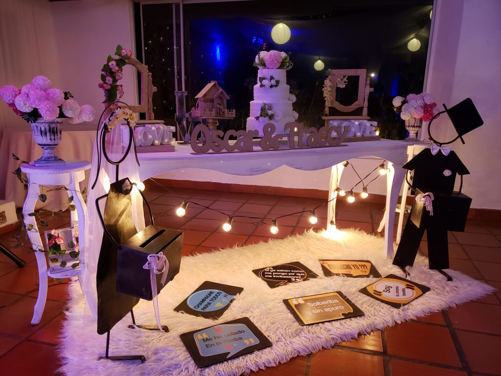 - Decoración del lugar con: Centros de mesa personalizados, decoración mesa de torta con diferentes accesorios de madera y letreros de boda, letreros de bienvenida, pétalos de rosa naturales, cofre lluvia de sobres con mesa iluminada, decoración de flechas señalización, extensiones vintage con bombillos tipo pimpón, banderines blancos en tela, bicicletas vintage decorativas, letreros gigante de bienvenida ect.